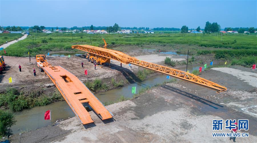 7月10日,工作人員在演練現(xiàn)場搭建機(jī)械化橋梁(無人機(jī)照片)。當(dāng)日,由吉林省交通運(yùn)輸廳主辦的公路橋梁水毀搶通應(yīng)急演練在長春市雙陽區(qū)雙陽河舉行,參與演練人員從汛情水毀信息報(bào)送、應(yīng)急裝備快速集結(jié)、機(jī)械化橋梁搶通搭設(shè)、善后處理等方面進(jìn)行實(shí)戰(zhàn)演練。新華社記者張楠攝