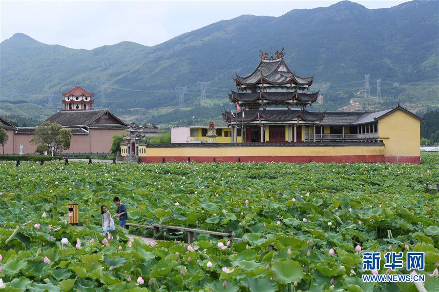 7月3日,浦源村鯉魚溪公園內(nèi)荷花盛開,吸引游人前來(lái)觀賞(無(wú)人機(jī)照片)。新華社記者 姜克紅 攝