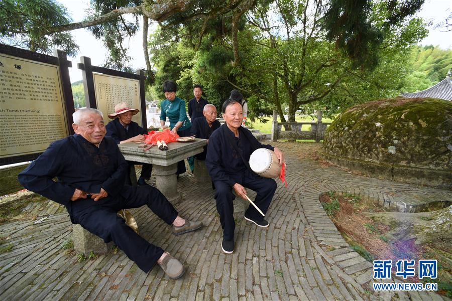 7月4日,幾名參加魚祭習俗展示的浦源村民在樹蔭下休息。魚祭習俗是為死去的鯉魚舉行送葬儀式,是浦源村特有的習俗。新華社記者 姜克紅 攝