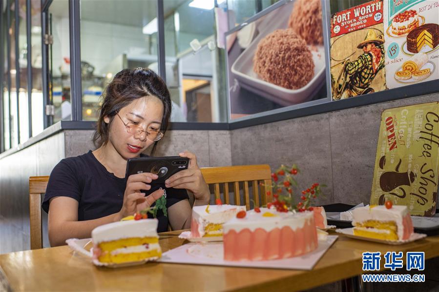 在位于新疆精河縣城的一家糕點店,朱虹美團隊在錄制視頻,介紹創(chuàng)意食品——由枸杞果醬、鮮枸杞制作的“枸杞蛋糕”(7月11日攝)。新華社記者 胡虎虎 攝