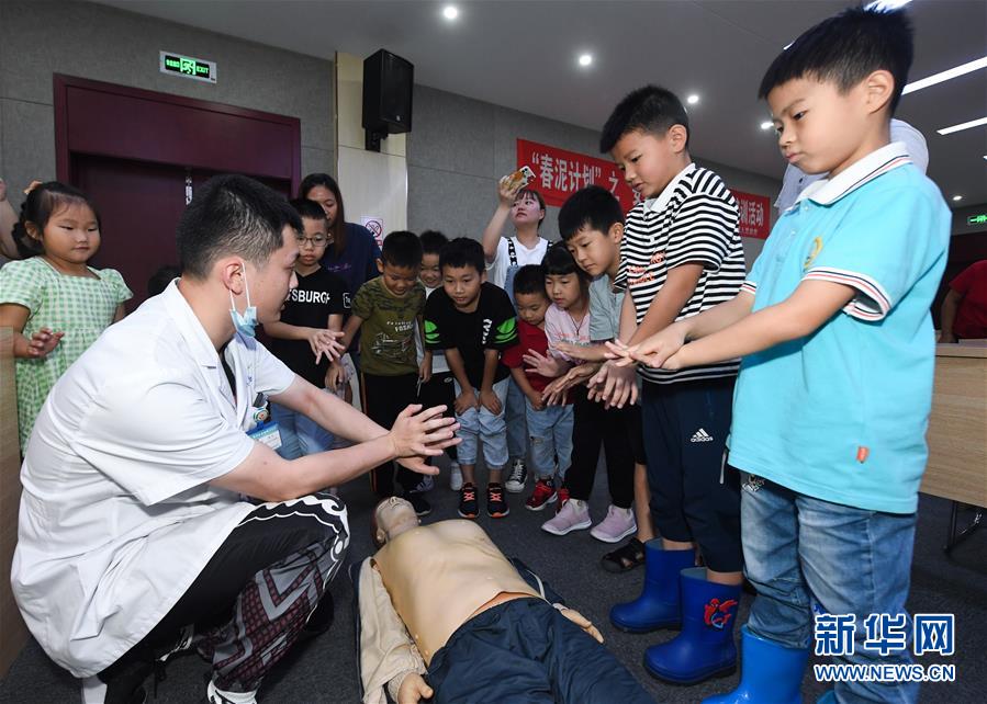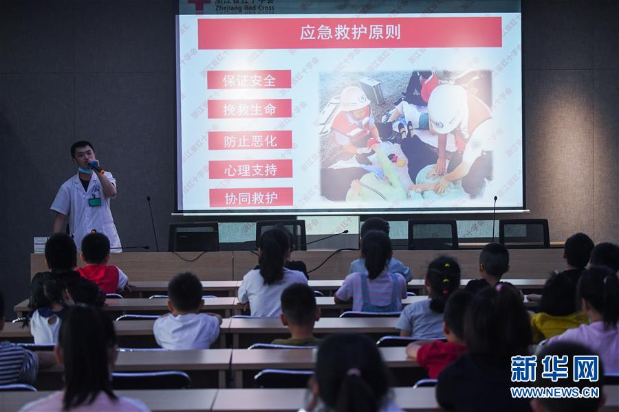 7月16日,東林鎮(zhèn)衛(wèi)生院的醫(yī)護人員(左一)在給學生們上應(yīng)急救護課。當日,浙江省湖州市吳興區(qū)東林鎮(zhèn)舉辦暑期“安全防護小超人”主題活動。活動由醫(yī)護人員、消防隊員等為學生及家長講授日常安全避險及溺水急救知識,中小學們還在現(xiàn)場學習了簡易包扎、心肺復蘇的正確方式,并了解滅火器、滅火毯等消防器材的使用,為學生平安過暑期打好安全防護“預防針”。新華社記者 徐昱 攝