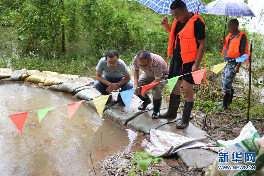7月16日,樅陽縣水利局高級(jí)工程師舒曉安(左二)查看之前處置的險(xiǎn)情發(fā)生點(diǎn)。受長江持續(xù)高水位影響,安徽省樅陽縣的鐵銅鄉(xiāng)江心洲已于近日將江心洲上的居民轉(zhuǎn)移安置,而包括搶險(xiǎn)隊(duì)員、鄉(xiāng)鎮(zhèn)干部、水利工程師等在內(nèi)的近300人“留守”在江心洲上巡堤查險(xiǎn),守護(hù)家園。鐵銅鄉(xiāng)位于長江江心洲上,有4個(gè)行政村52個(gè)村民組,耕地面積12000多畝。新華社記者黃博涵攝