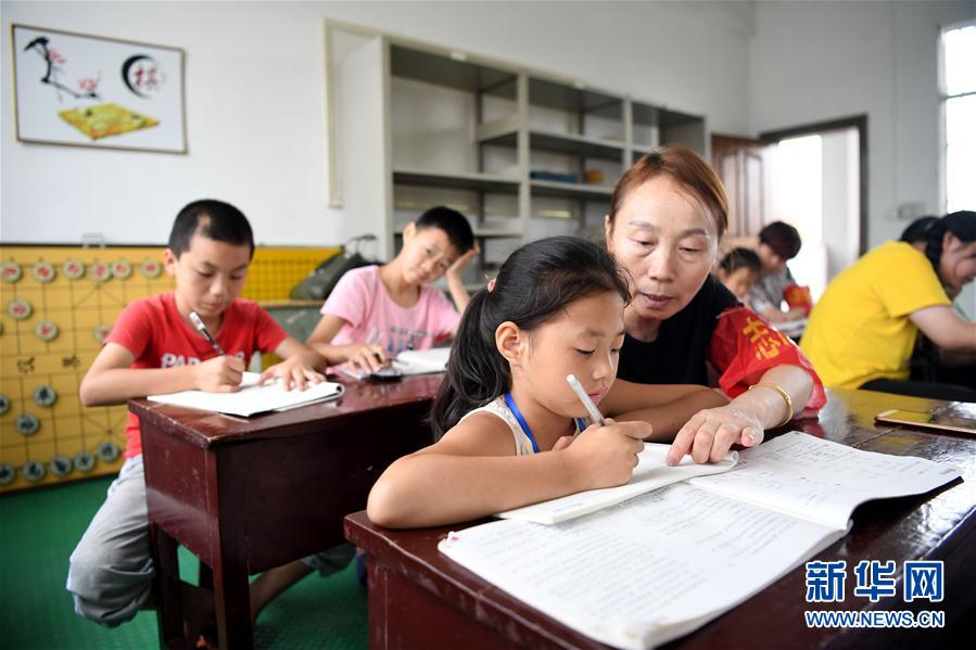 7月16日,在安徽省宿松縣洲頭鄉(xiāng)中心小學(xué)集中安置點,教師志愿者輔導(dǎo)孩子們完成暑假作業(yè)。
