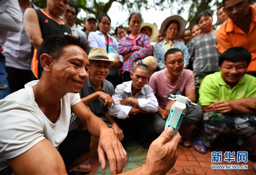 7月15日,瓊中縣什運(yùn)鄉(xiāng)便文村村民在了解電動(dòng)割膠刀的構(gòu)造。當(dāng)日,海南瓊中黎族苗族自治縣什運(yùn)鄉(xiāng)為542名貧困戶免費(fèi)發(fā)放電動(dòng)割膠刀,割膠刀研發(fā)單位為貧困戶提供使用技能培訓(xùn)。海南有著豐富的天然橡膠資源,但傳統(tǒng)膠刀的割膠技術(shù)要求高,農(nóng)民難以掌握,許多膠林閑置。電動(dòng)割膠刀使割膠簡(jiǎn)單易學(xué),幫助村民提高割膠效率,助力脫貧增收。新華社記者郭程攝