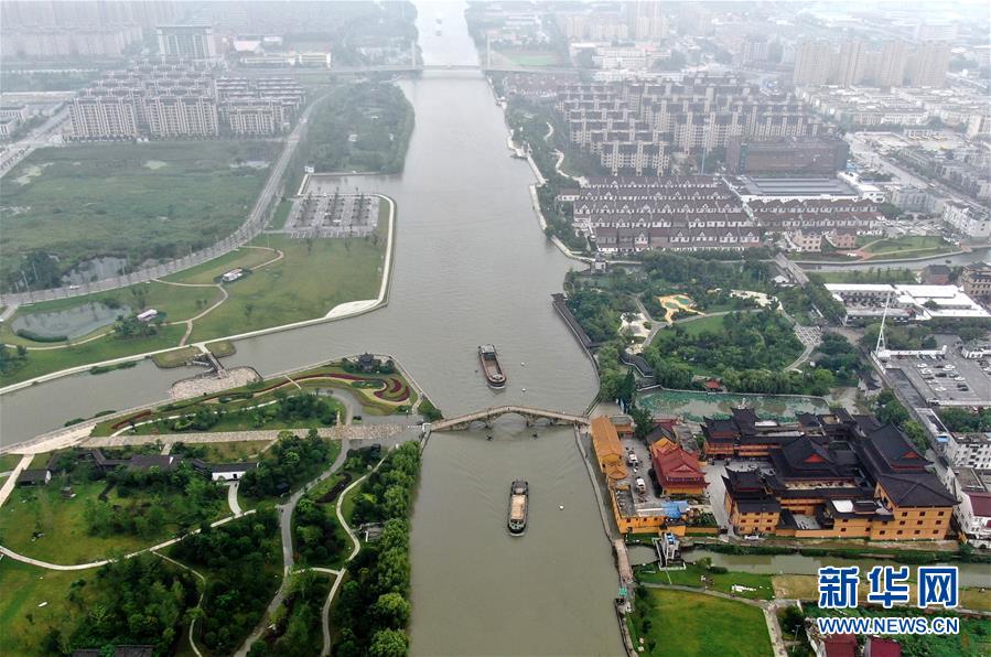 7月17日拍攝的秀洲區(qū)王江涇鎮(zhèn)長虹橋附近的河道(無人機照片)。浙江省嘉興市秀洲區(qū)處在杭嘉湖平原,受持續(xù)強降雨及上游排水影響,近期,秀洲區(qū)境內(nèi)的京杭大運河分支航道持續(xù)保持較高水位。當(dāng)?shù)叵嚓P(guān)部門嚴陣以待,落實各項措施,確保安全度汛。新華社記者韓傳號攝