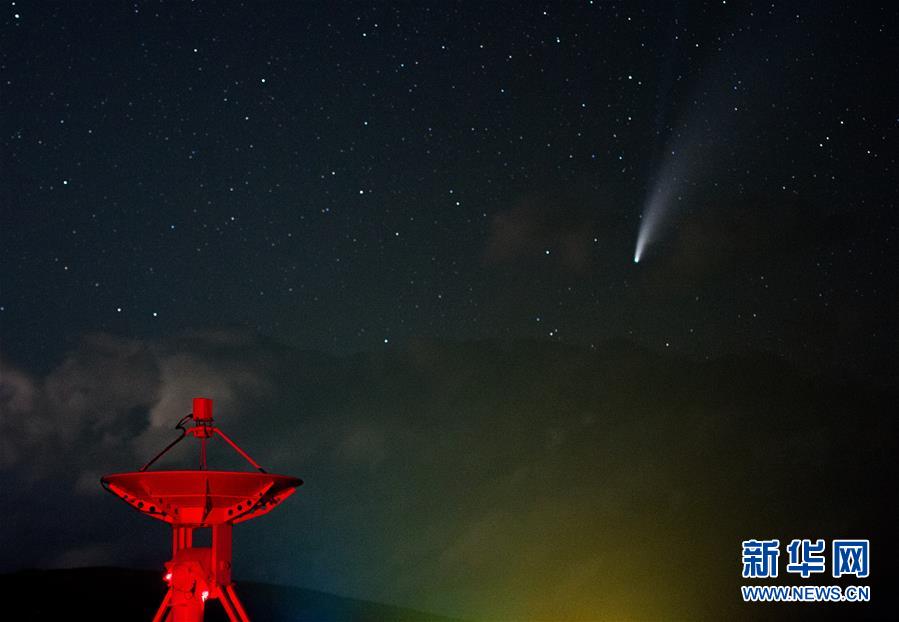 7月18日晚,在明安圖觀測基地,尼歐懷茲彗星劃過天際。7月18日晚至19日凌晨,在位于內(nèi)蒙古錫林郭勒盟正鑲白旗境內(nèi)的國家天文臺明安圖觀測基地,尼歐懷茲彗星劃過天際。在明安圖觀測基地內(nèi),排列著100面白色的拋物面天線。這個龐大的天線陣列便是草原“天眼”——明安圖射電頻譜日像儀。草原“天眼”持續(xù)接收太陽射電輻射,然后由科研人員進行數(shù)據(jù)分析研究,對空間環(huán)境監(jiān)測、太陽活動預報均有重要作用。新華社記者連振攝