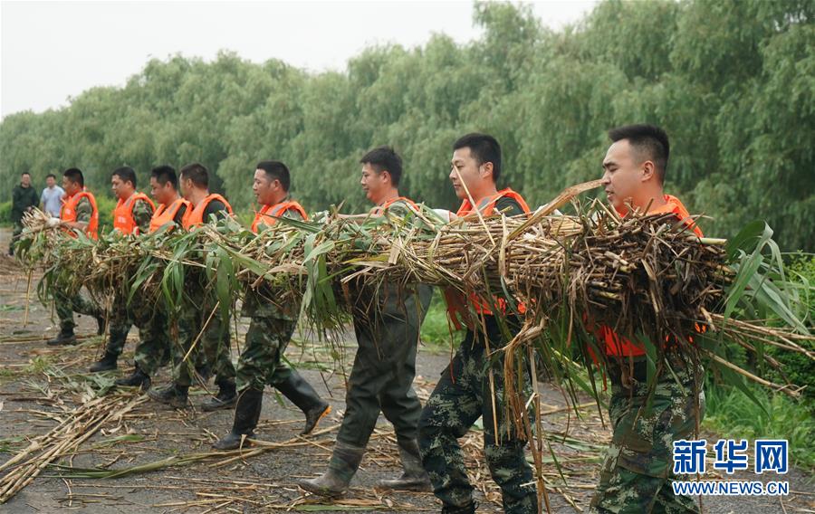 在鎮(zhèn)江市丹徒區(qū)世業(yè)鎮(zhèn)先鋒村西南大堤,中國安能集團(tuán)第二工程局常州分公司防汛前置備勤隊(duì)員準(zhǔn)備將捆好的蘆葦放在江堤邊(7月17日攝)。捆蘆葦護(hù)邊坡、機(jī)器人進(jìn)涵洞、“養(yǎng)水盆”防滲漏……在江蘇鎮(zhèn)江,當(dāng)?shù)馗刹咳罕姾蛯I(yè)力量,因地制宜就地取材,老辦法搭配新技術(shù),一批險(xiǎn)情得以消除在萌芽狀態(tài)。新華社記者季春鵬攝