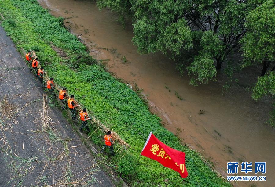 在鎮(zhèn)江市丹徒區(qū)世業(yè)鎮(zhèn)先鋒村西南大堤,中國安能集團第二工程局常州分公司防汛前置備勤隊員準備將捆好的蘆葦放在江堤邊(7月17日攝,無人機照片)。捆蘆葦護邊坡、機器人進涵洞、“養(yǎng)水盆”防滲漏……在江蘇鎮(zhèn)江,當(dāng)?shù)馗刹咳罕姾蛯I(yè)力量,因地制宜就地取材,老辦法搭配新技術(shù),一批險情得以消除在萌芽狀態(tài)。新華社記者季春鵬攝