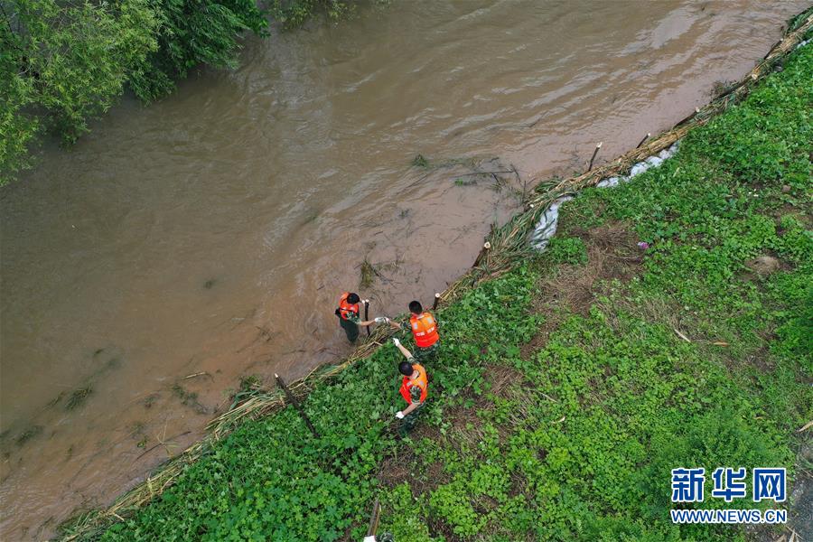 在鎮(zhèn)江市丹徒區(qū)世業(yè)鎮(zhèn)先鋒村西南大堤,中國安能集團第二工程局常州分公司防汛前置備勤隊員在用木樁固定捆好的蘆葦(7月17日攝,無人機照片)。捆蘆葦護邊坡、機器人進涵洞、“養(yǎng)水盆”防滲漏……在江蘇鎮(zhèn)江,當?shù)馗刹咳罕姾蛯I(yè)力量,因地制宜就地取材,老辦法搭配新技術(shù),一批險情得以消除在萌芽狀態(tài)。新華社記者季春鵬攝