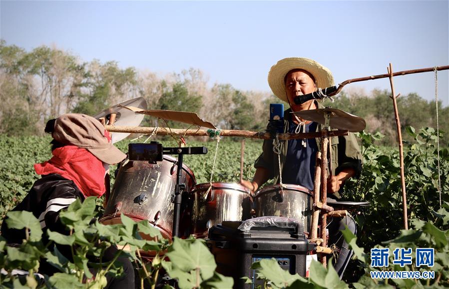 在新疆瑪納斯縣的棉田里,張宏遠(yuǎn)的妻子張曉琴為他錄制視頻(7月14日攝)。新華社記者孫哲攝