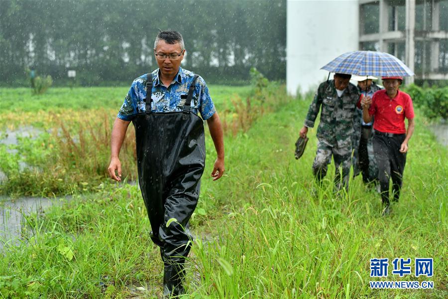 劉良武(右)與巡查人員在堤壩內(nèi)側(cè)處理一處泡泉(7月19日攝)。新華社記者張浩波攝