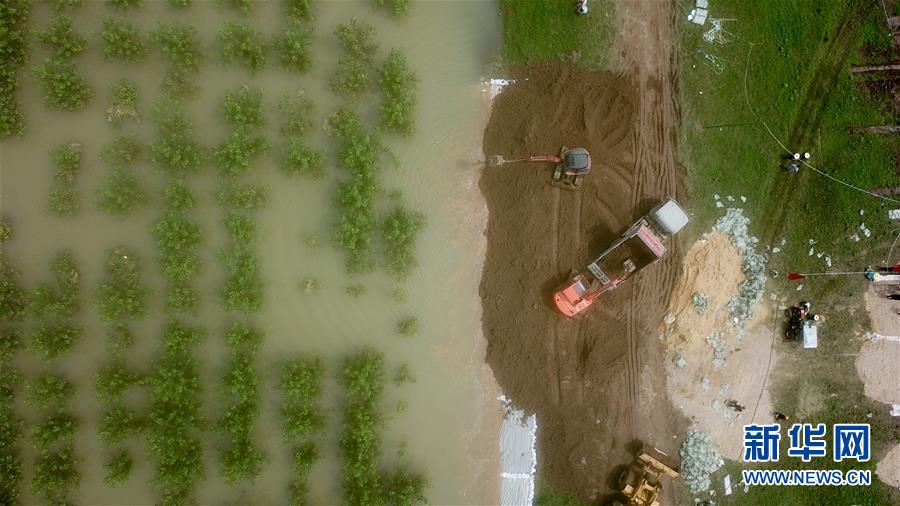 7月20日,在永固垸西線防洪大堤,工作人員處置滲漏險(xiǎn)情(無(wú)人機(jī)照片)。