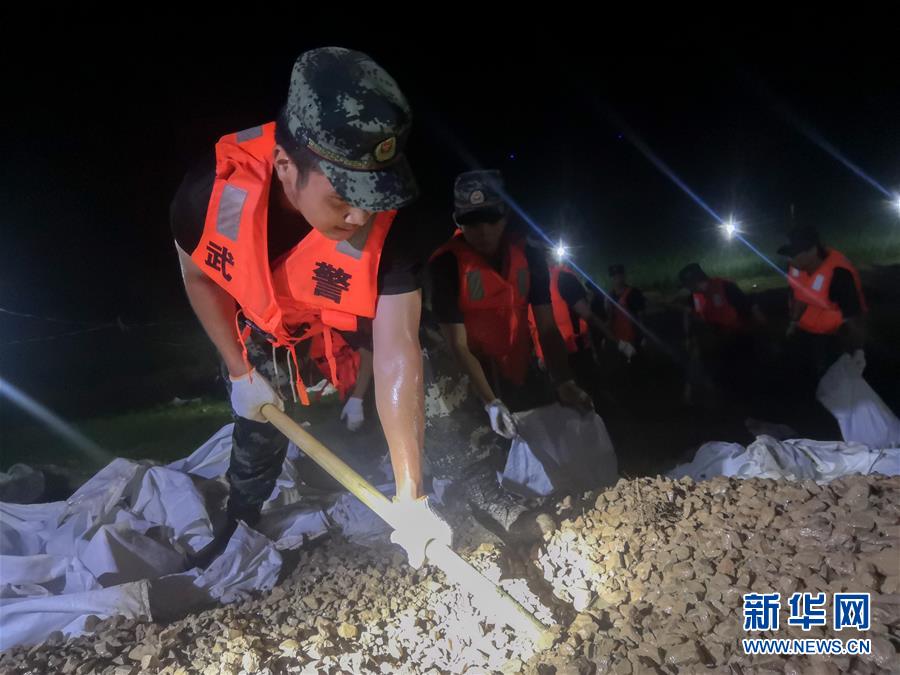 7月20日,在永固垸西線防洪大堤,武警湖南總隊(duì)岳陽支隊(duì)官兵處置滲漏險(xiǎn)情。新華社發(fā)(尋樹文攝)