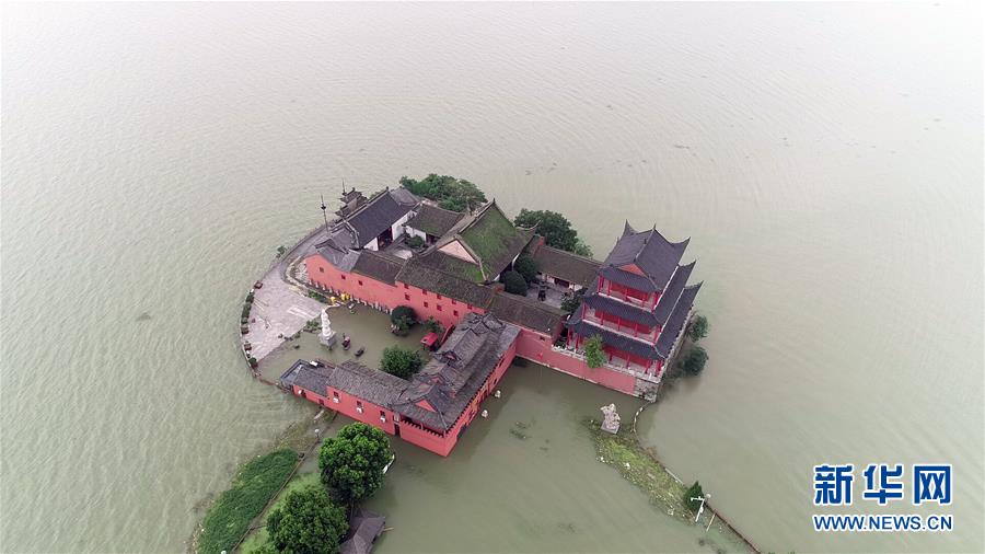 7月21日在安徽省合肥市巢湖邊拍攝的被水淹的建筑(無人機照片)。當日10時24分,巢湖中廟站水位達到13.36米,該水位系巢湖洪水設防的百年一遇標準。新華社記者屈彥攝