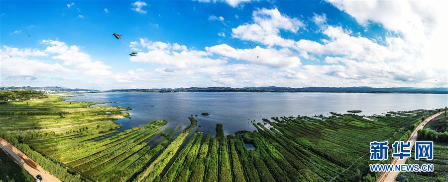 鳥兒在草海上空飛翔(無人機(jī)全景照片,6月9日攝)。新華社記者楊文斌攝