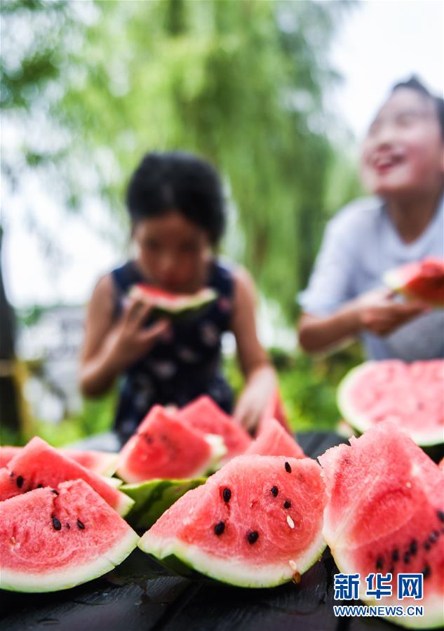 7月22日,廟兜村的孩子們在比賽吃西瓜。當(dāng)日是大暑節(jié)氣,浙江省湖州市吳興區(qū)織里鎮(zhèn)廟兜村舉行了趣味“賽西瓜”比賽,迎接這個“火熱”的節(jié)氣。廟兜村種植有500多畝西瓜,目前正值西瓜豐收的時節(jié),村民們用“賽西瓜”的形式,感受豐收的喜悅。新華社記者徐昱攝