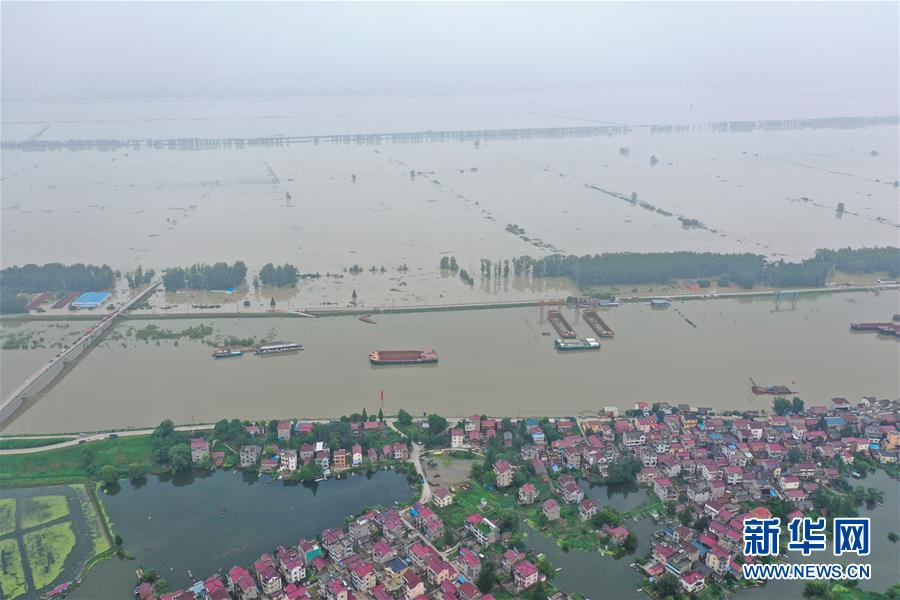 7月21日拍攝的水陽(yáng)江對(duì)岸被淹的南京市高淳區(qū)陽(yáng)江鎮(zhèn)勝利圩(無(wú)人機(jī)照片)。新華社記者季春鵬攝
