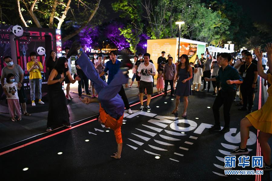 7月23日晚,在成都市成華區(qū)望平街濱河路的天府文創(chuàng)大集市上,演員在表演街頭環(huán)境音樂劇。新華社記者 王曦 攝