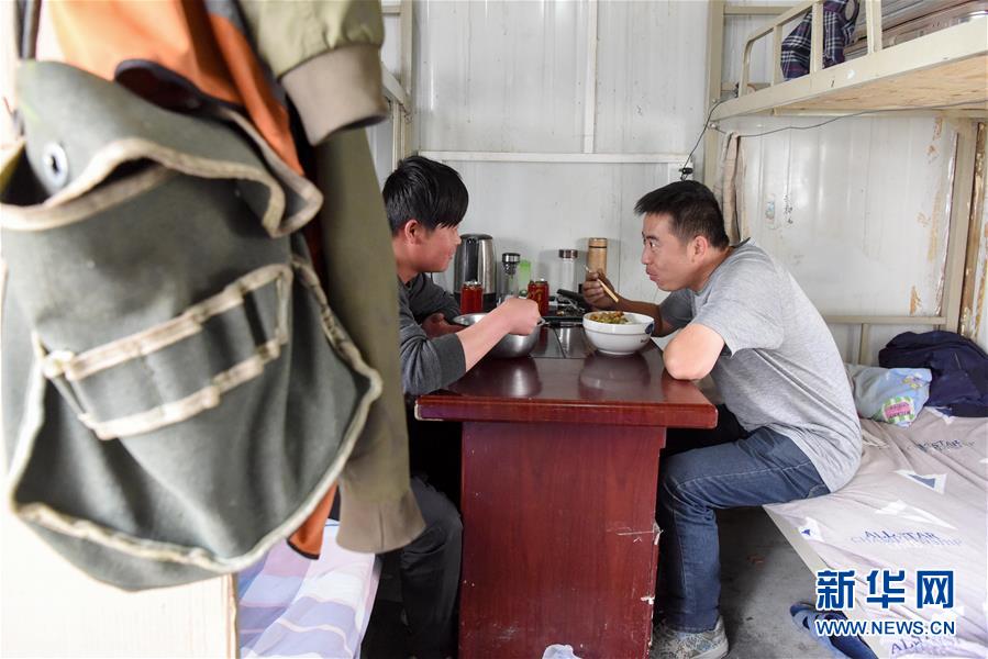 在索爾庫里宿營地,中鐵一局的施工人員在“白皮列車”內(nèi)吃午飯(7月19日攝)。新華社記者 丁磊 攝