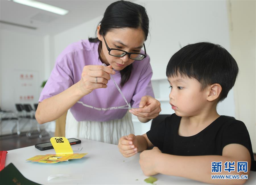 7月27日,導(dǎo)師帶領(lǐng)小朋友制作植物標(biāo)本。新華社記者 翁忻旸 攝