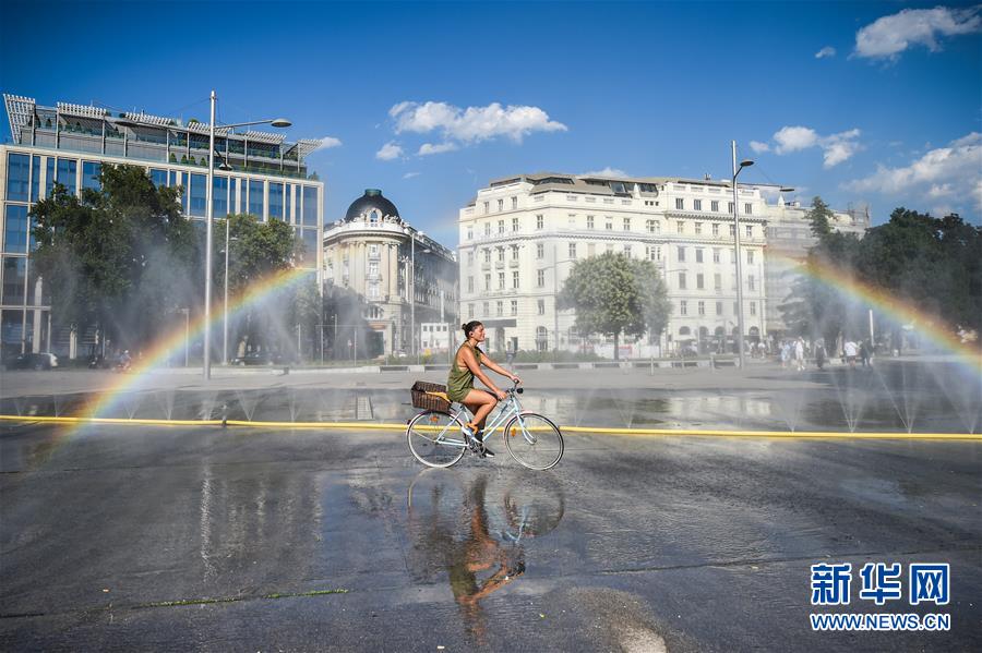 7月28日,在奧地利維也納,一名女子騎車經(jīng)過一處廣場的噴水設施。新華社記者郭晨攝