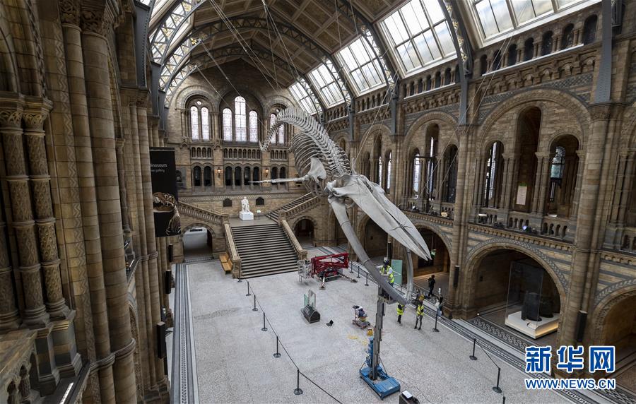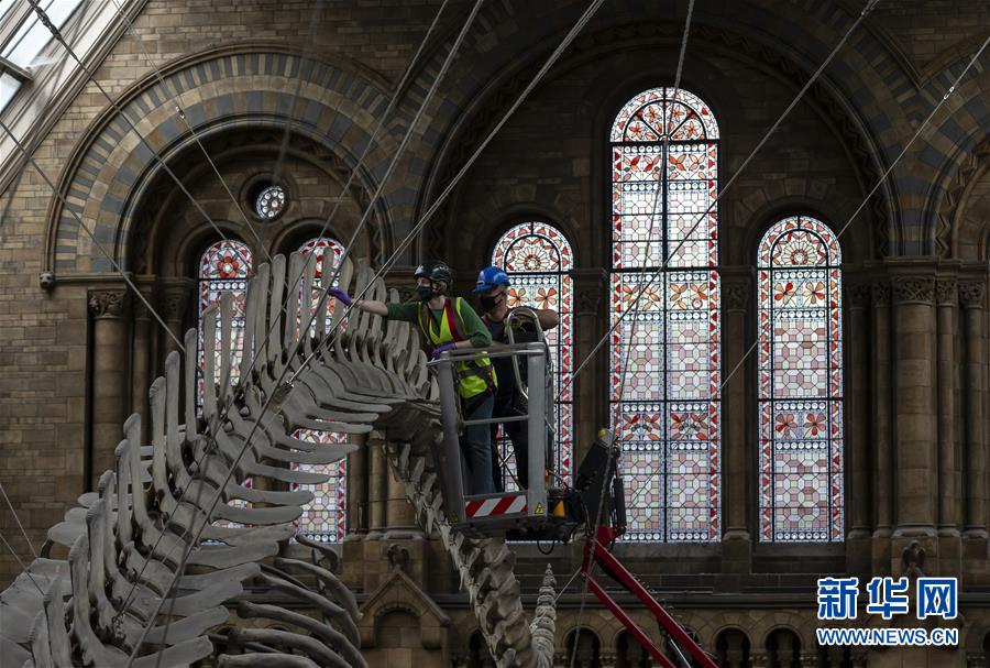7月27日,工作人員在英國倫敦的自然歷史博物館大廳內清潔一具藍鯨骨架。受新冠疫情影響關閉數月的英國自然歷史博物館將于8月5日重新對外開放,目前館方正在為重新開放做最后準備。參觀者需要提前預約參觀時段、全程佩戴口罩且保持安全距離。新華社記者韓巖攝