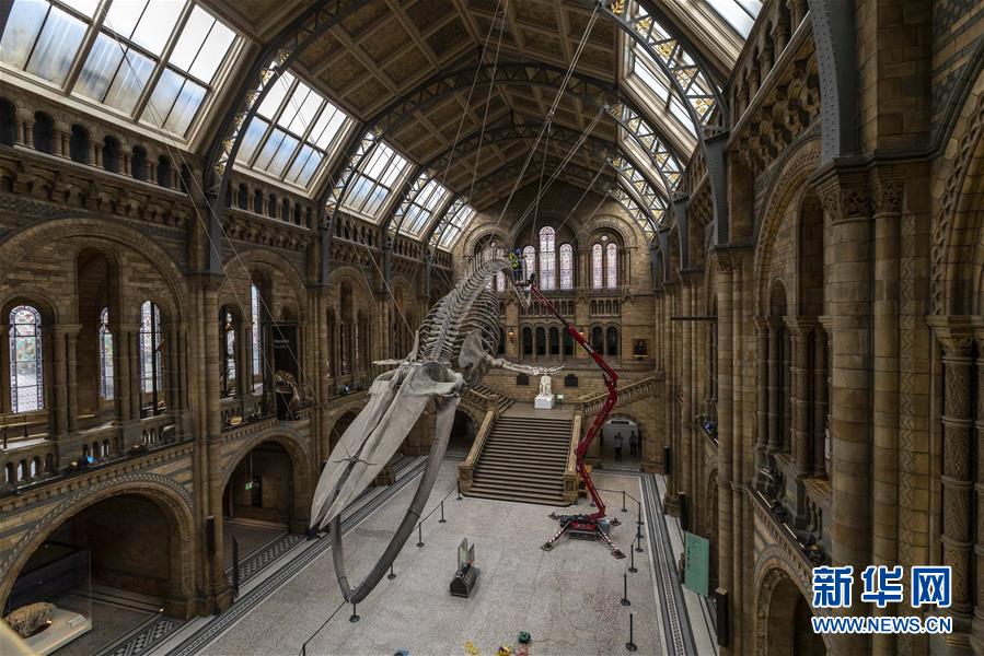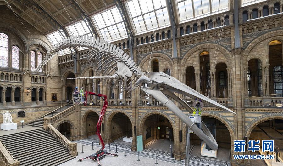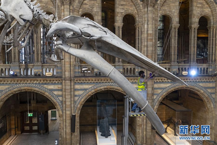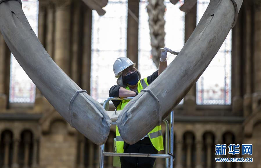 7月27日,一名工作人員在英國倫敦的自然歷史博物館大廳內清潔一具藍鯨骨架。受新冠疫情影響關閉數月的英國自然歷史博物館將于8月5日重新對外開放,目前館方正在為重新開放做最后準備。參觀者需要提前預約參觀時段、全程佩戴口罩且保持安全距離。新華社記者韓巖攝