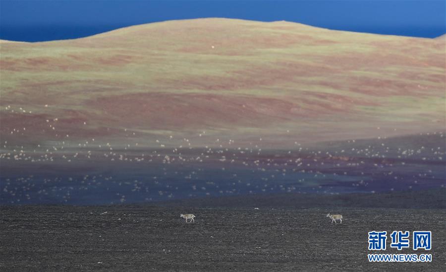 這是7月7日在可可西里卓乃湖區(qū)域拍攝的兩只藏羚羊。新華社記者張龍攝