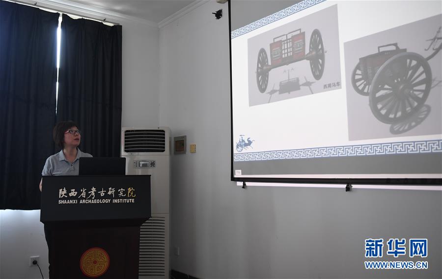 7月30日,在陜西省考古研究院涇渭基地,陜西省考古研究院副研究員黃曉娟介紹西周晚期青銅輪牙馬車復原情況。新華社記者李一博攝