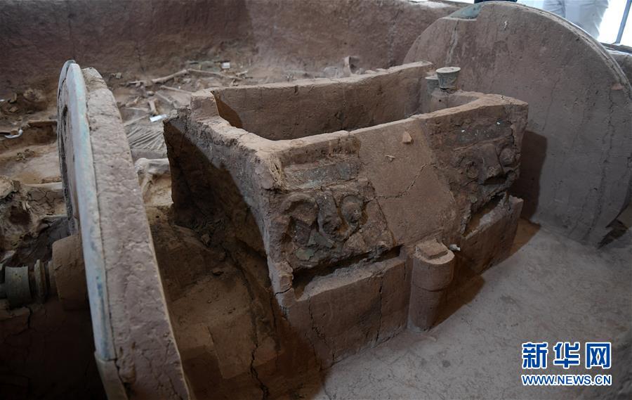 這是7月30日在陜西省考古研究院涇渭基地拍攝的西周晚期青銅輪牙馬車車廂部分。新華社記者李一博攝