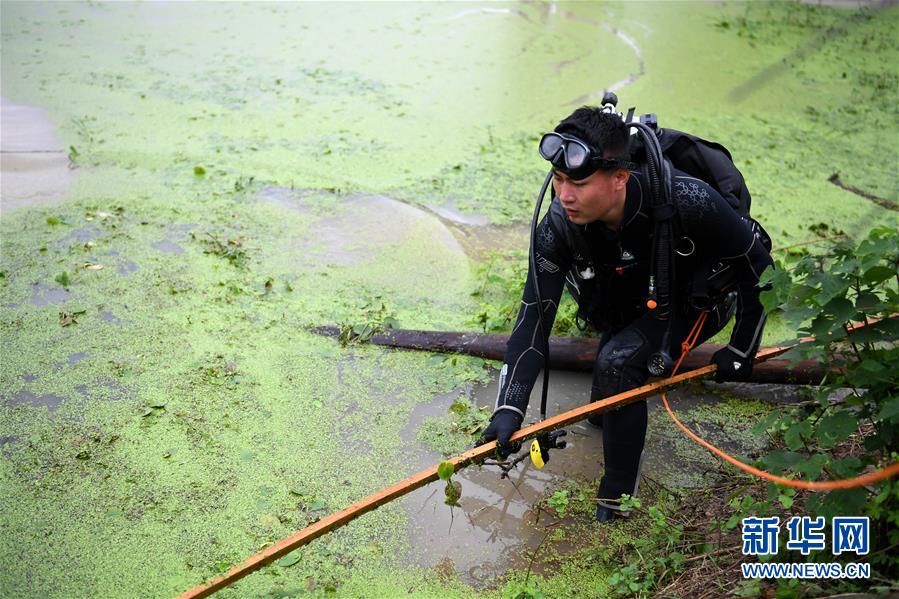 7月24日,在安徽省廬江縣臺(tái)創(chuàng)園小南河段,吳正寶(左)和徐宏林準(zhǔn)備潛水。新華社記者劉軍喜攝