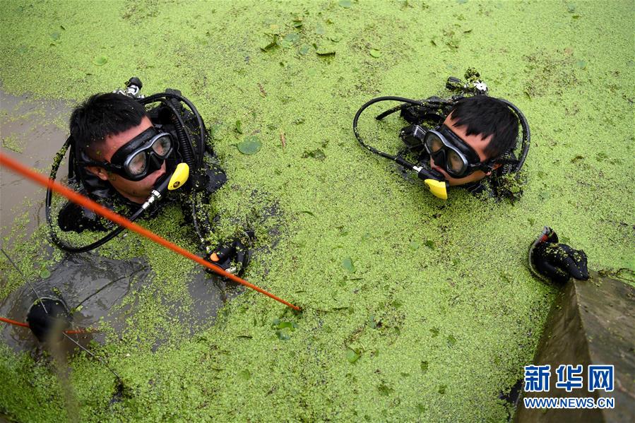7月24日,在安徽省廬江縣臺創(chuàng)園小南河段,吳正寶(左)和徐宏林準備潛水。新華社記者劉軍喜攝