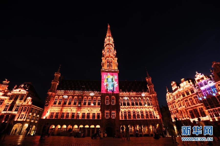 7月29日,人們在比利時布魯塞爾大廣場欣賞聲光秀,市政廳外墻上投射出鮮花地毯主題的圖案。7月29日,比利時布魯塞爾大廣場舉行大型聲光秀。藝術家在市政廳等歷史建筑上投影文字和圖案,紀念這個夏天受新冠疫情影響而不能如期舉辦的文化活動。新華社記者鄭煥松攝