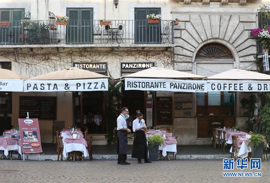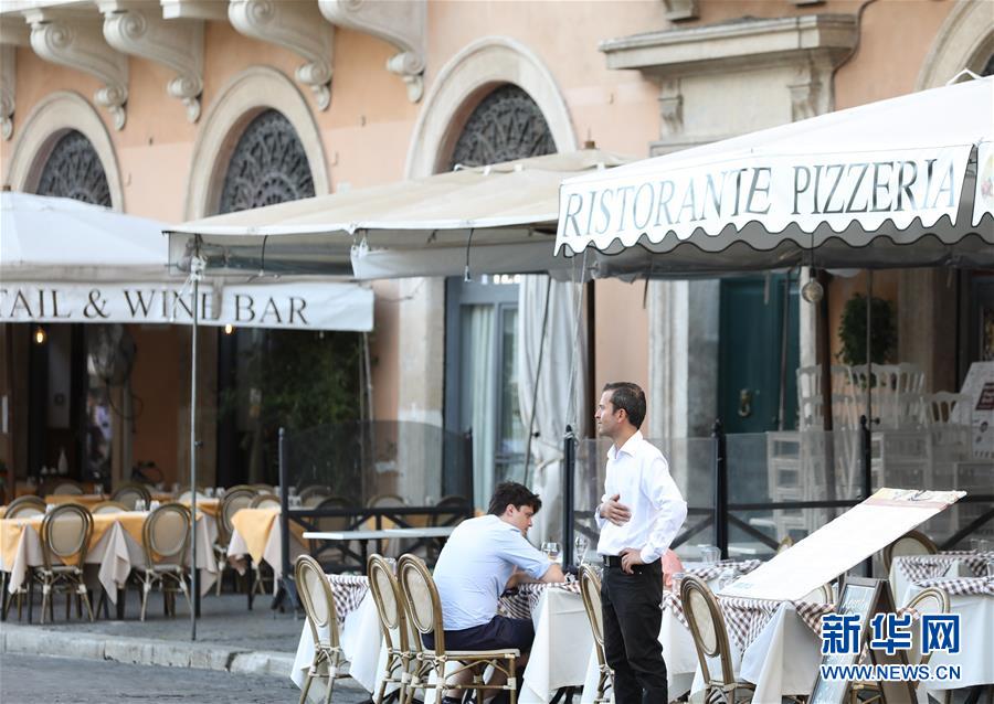 8月4日,人們?cè)谝獯罄锥剂_馬一家餐廳用餐。受新冠疫情影響,今年夏天羅馬的歷史中心區(qū)游客比往年明顯減少。新華社記者程婷婷攝