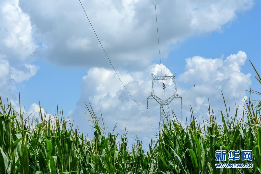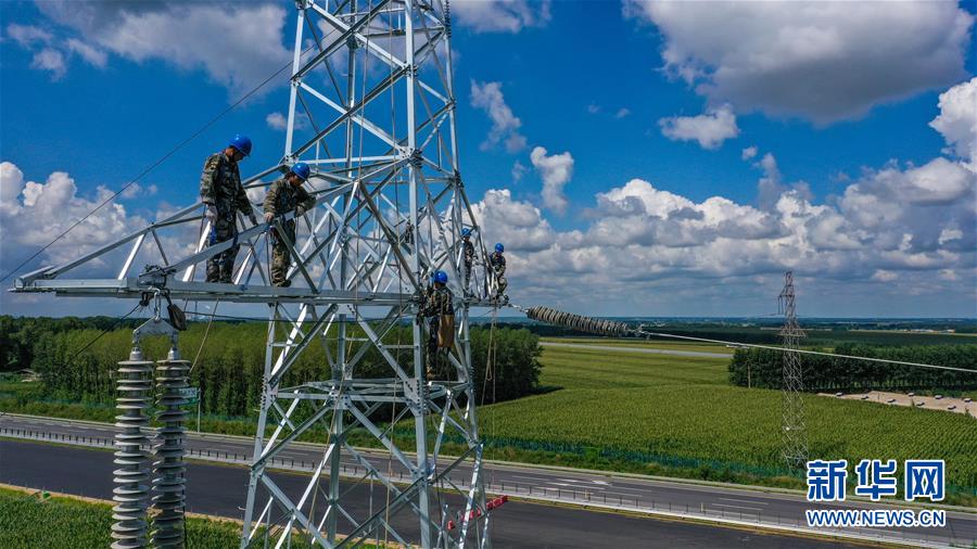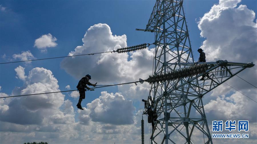 8月6日,送電工在吉林省長春市城郊的一處輸電鐵塔上施工作業(yè)。吉林省長春市連續(xù)多日出現(xiàn)高溫天氣,國網(wǎng)長春供電公司輸電運(yùn)檢中心的送電工們每天清晨開始作業(yè),不畏烈日“烤”驗,堅守工作崗位,確保工程按計劃完成。新華社記者張楠攝