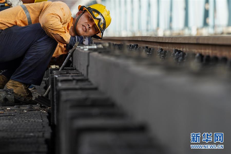 8月6日,橋隧工郭繼浩在南京長(zhǎng)江大橋作業(yè)點(diǎn)安裝護(hù)木螺桿。新華社記者李博攝