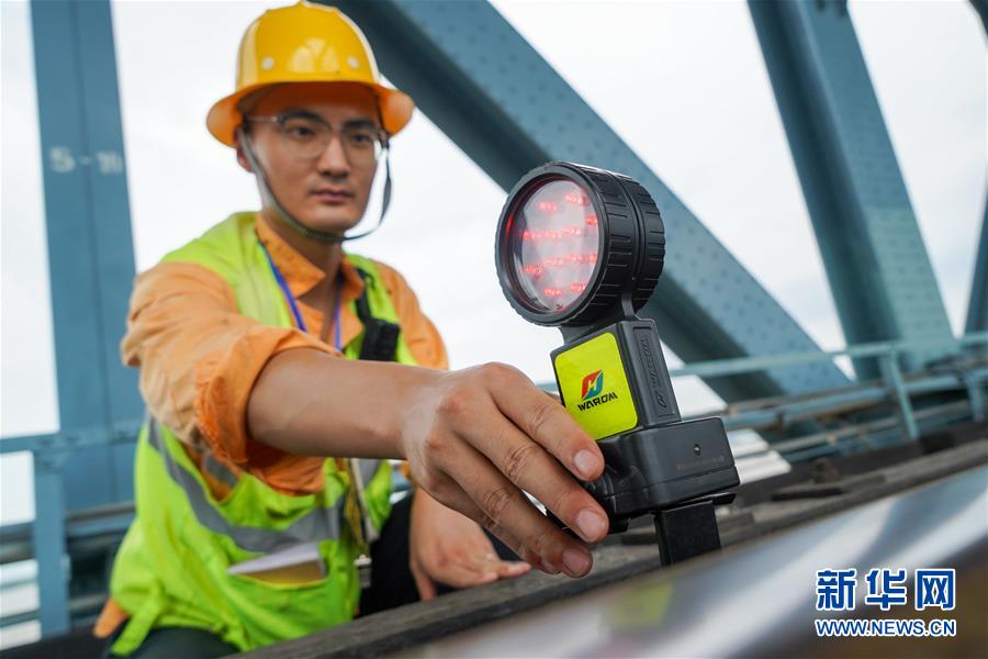 8月6日,防護(hù)員陳飛在南京長(zhǎng)江大橋作業(yè)點(diǎn)安放施工作業(yè)防護(hù)燈。新華社記者李博攝