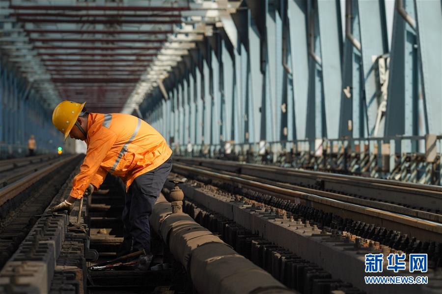 8月6日,一位橋隧工在南京長(zhǎng)江大橋作業(yè)點(diǎn)拆螺桿。新華社記者李博攝