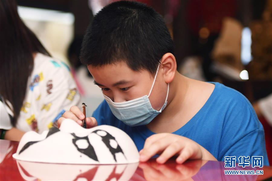 8月8日,小朋友在長(zhǎng)沙市非物質(zhì)文化遺產(chǎn)展示館體驗(yàn)湘劇臉譜繪制。暑假期間,許多小朋友來(lái)到位于湖南省長(zhǎng)沙市橘子洲景區(qū)的長(zhǎng)沙市非物質(zhì)文化遺產(chǎn)展示館參觀體驗(yàn)。新華社記者 薛宇舸 攝