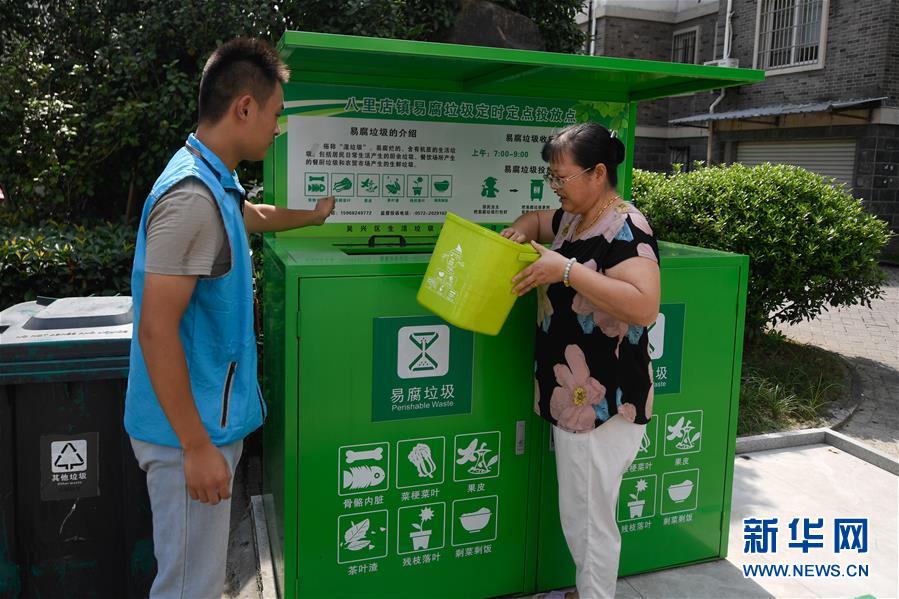 8月9日,湖州市吳興區(qū)八里店鎮(zhèn)百合苑居民(右)投放易腐垃圾。近年來,浙江省通過創(chuàng)新宣傳教育,多措并舉促進垃圾分類投放、收運及處置的良性循環(huán),引領垃圾分類成為城鄉(xiāng)居民的生活新風尚。新華社記者黃宗治攝。