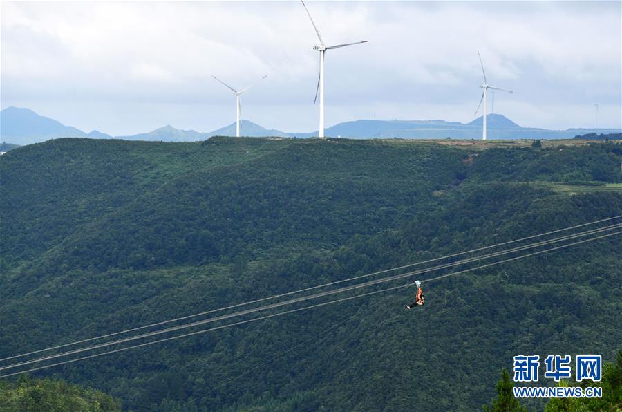 8月8日,游客在貴州省龍里油畫大草原乘坐滑索觀光。近日,貴州省黔南布依族苗族自治州龍里縣境內(nèi)氣候宜人,龍里油畫大草原、“龍門鎮(zhèn)”武俠文化主題景區(qū)等景點(diǎn)吸引眾多游客前來觀光旅游。新華社記者楊文斌攝。