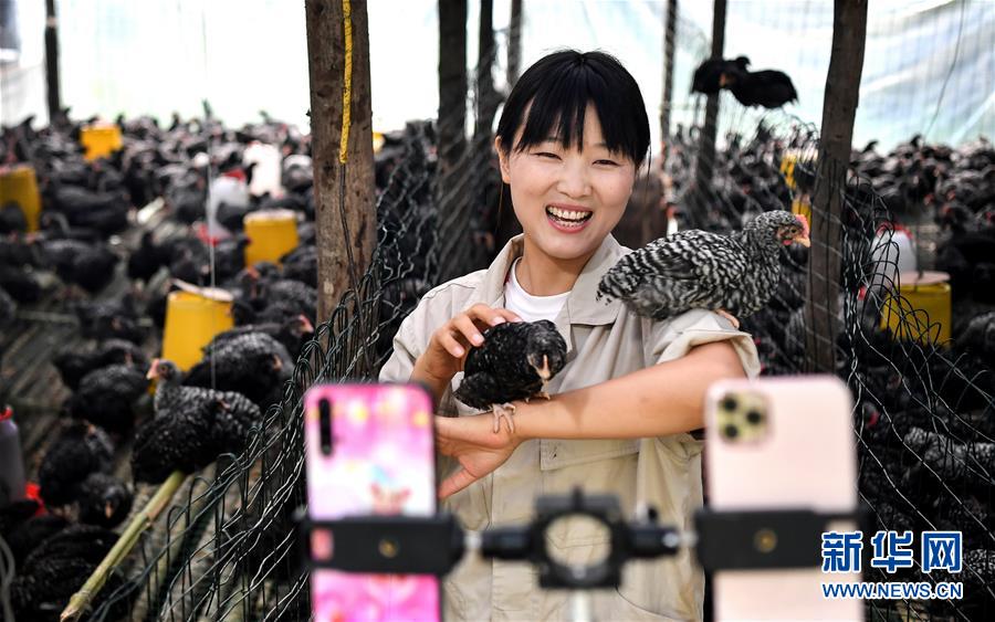 陜西商洛市丹鳳縣寺坪鎮(zhèn)寺坪村的網(wǎng)絡(luò)主播李萌在直播介紹自家養(yǎng)的蘆花雞(7月20日攝)。陜西丹鳳縣位于秦嶺東段南麓,依山傍水、農(nóng)特產(chǎn)品豐富。近年來,隨著網(wǎng)絡(luò)銷售模式的興起,當?shù)胤e極培育壯大“本土網(wǎng)紅”隊伍,通過網(wǎng)絡(luò)直播、線上銷售、線下配送等形式,助力秦嶺山區(qū)優(yōu)質(zhì)農(nóng)產(chǎn)品走出大山,帶動百姓增收致富。新華社記者劉瀟攝。