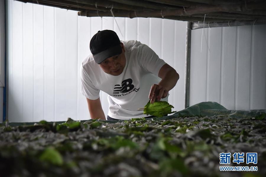 在貴州省畢節(jié)市納雍縣勺窩鎮(zhèn),納雍縣瑞慧桑蠶養(yǎng)殖發(fā)展有限責(zé)任公司負(fù)責(zé)人在查看桑蠶飼養(yǎng)情況(7月21日攝)。新華社記者駱飛攝。
