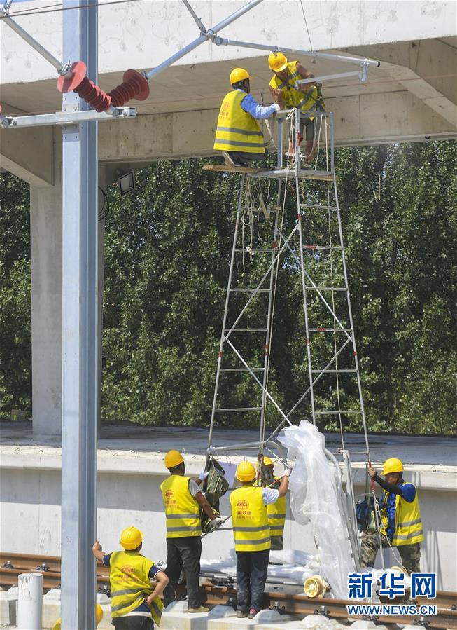 8月10日,工人在京雄城際鐵路霸州北站建設工地為接觸網(wǎng)卡定位。京雄城際鐵路霸州北站站臺雨棚混凝土結構施工日前全部完成,目前霸州北站已全面轉入裝飾裝修和機電安裝階段,預計2020年底投入使用。京雄城際鐵路是連接北京市區(qū)、大興機場和雄安新區(qū)的重要干線。建成后,將進一步完善京津冀區(qū)域高速鐵路網(wǎng)結構,便利沿線群眾出行,對于推動京津冀協(xié)同發(fā)展和支撐建設雄安新區(qū)具有重要意義。新華社記者李曉果攝。
