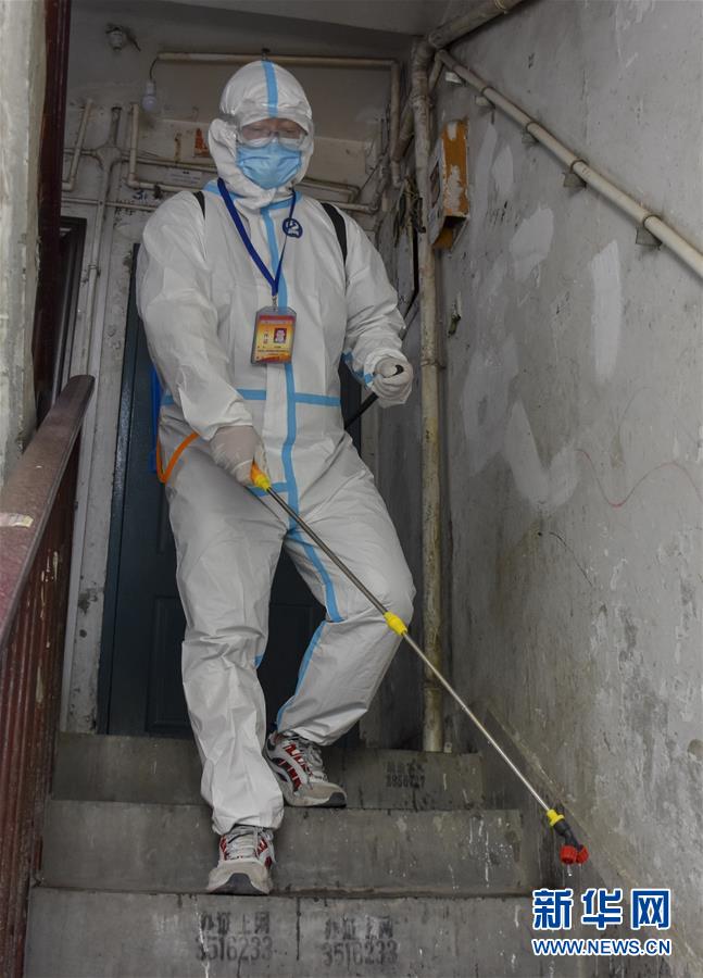 8月12日,烏魯木齊市天山區(qū)山西巷社區(qū)工作人員王志鷹在對(duì)居民樓道進(jìn)行消毒。新華社記者 高晗