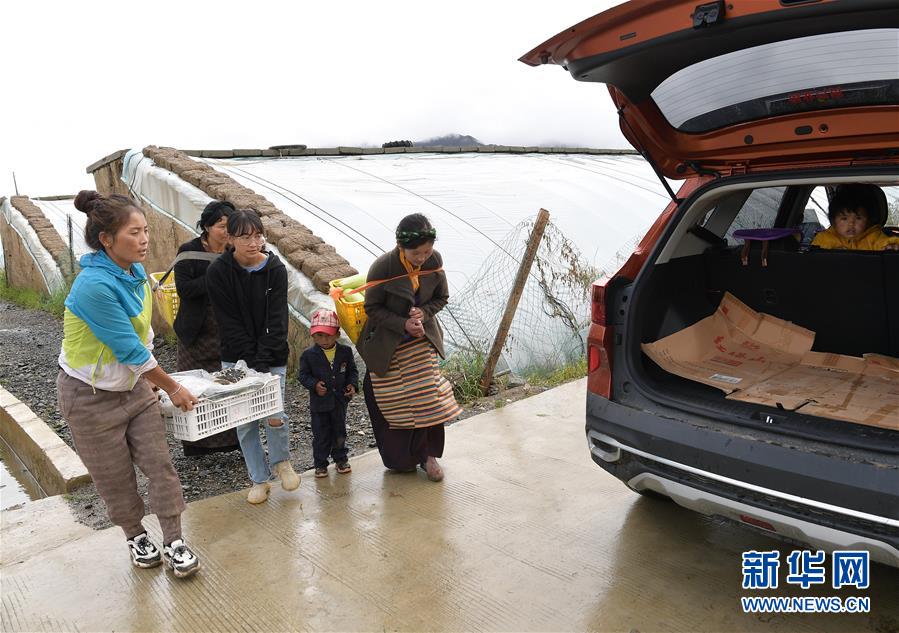 格桑旺姆(左三)和姐姐德吉卓瑪(左一)帶領(lǐng)工人將大棚出產(chǎn)的新鮮蔬菜抬上汽車,準(zhǔn)備運(yùn)往店鋪銷售(8月3日攝)。新華社記者 李賀 攝
