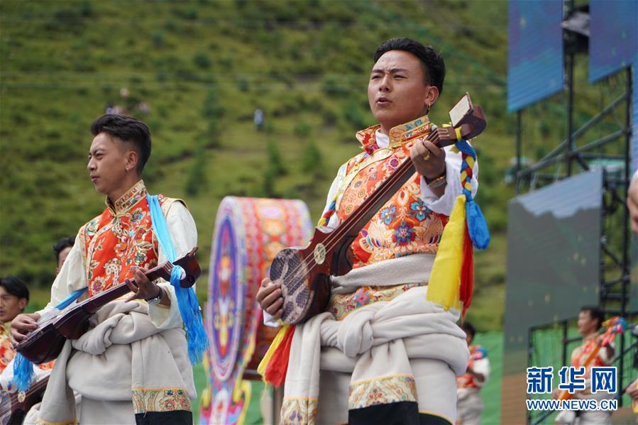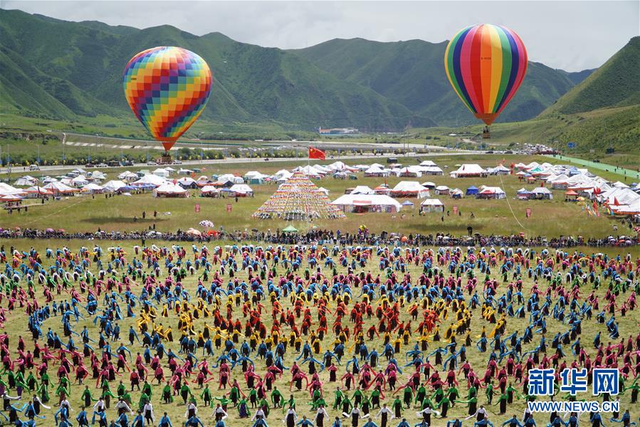 8月12日,演員在開幕式上表演舞蹈。當(dāng)日,2020中國碌曲鍋莊舞展演暨甘南藏族自治州第六屆少數(shù)民族傳統(tǒng)體育運(yùn)動會在甘肅省甘南州碌曲縣夏澤灘草原上舉行。開幕式上,三千余名身著節(jié)日盛裝的演員和當(dāng)?shù)厝罕娫诓菰掀鹞?,雨后初晴的草原上充滿歡聲笑語。新華社記者 耿馨寧 攝