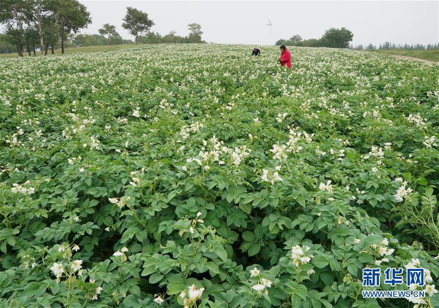8月12日,在尚義縣七甲鄉(xiāng)媽奶溝村,農民在田間管護旱作馬鈴薯。新華社記者 楊世堯 攝