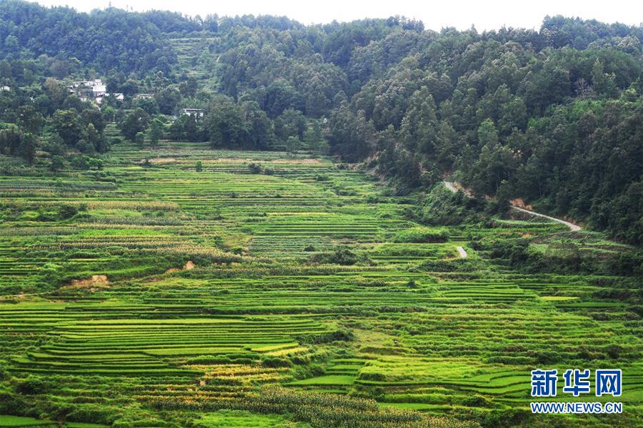 這是8月13日拍攝的鞍子鎮(zhèn)大林村梯田景色。時下,重慶市彭水苗族土家族自治縣鞍子鎮(zhèn)大林村的梯田景色迷人,構成一幅幅山鄉(xiāng)田園美景。新華社記者王全超攝