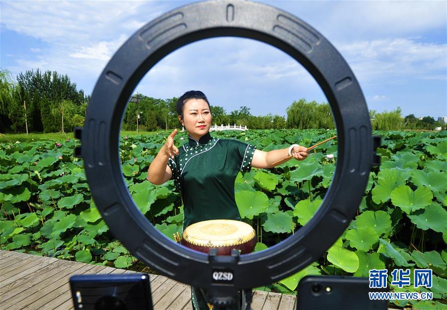 8月13日,河北省河間市西河大鼓非遺項目藝人李雪通過網絡直播表演西河大鼓。暑假期間,河北省河間市文化館推出非遺展演“云端”播系列活動,組織當地西河大鼓非遺項目傳承人利用視頻直播的方式進行線上展演,通過“云端”傳承非遺文化。新華社記者朱旭東攝